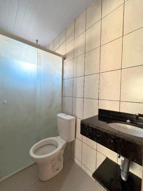 Banheiro com box e chuveiro elétrico.